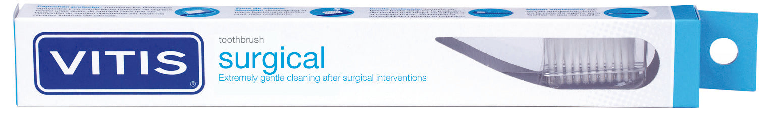 Dentaid Vitis Surgical Toothbrush представлява иновативна четка за зъби специално предназначена за почистване след хирургични интервенции. Четката за зъби на Dentaid е с ултра меки Tynex® влакна за изключително нежно почистване. Ефективно отстранява плаката и оставя венците и зъбите чисти. Със заоблена глава за деликатно почистване и включено в опаковката предпазно капаче. Monotip връхче за по-лесно отстраняване на упоритата плака. Продуктът е с ергономична и гъвкава дръжка, което го прави лесен за употреба.