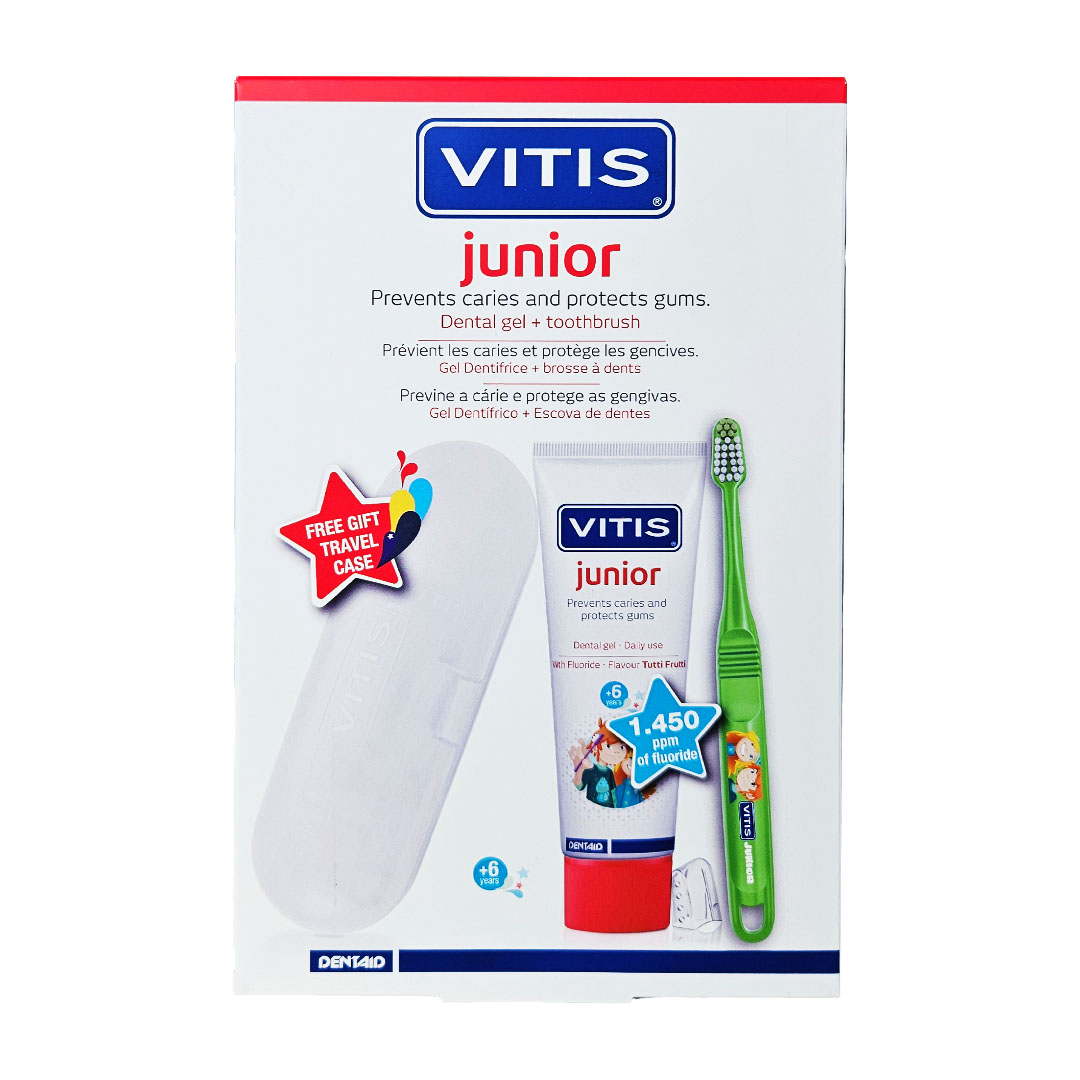 Пастата за зъби VITIS Junior е подходяща за деца над 6 години, съдържа ксилитол и флуороид 1450 ppm, предпазващи от появата на кариес. С вкус на тути фрути. Четката за зъби VITIS Junior е подходяща за ежедневна употреба на деца над 6 години. Проектирана е за ефективно премахване на замърсявания и плака и щадяща зъбния емайл.